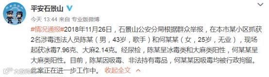 今天下午,石景山公安分局微博发布消息称,根据群众举报,在本市某小区抓获2名涉毒违法人员陈某(男,43岁,歌手)和何某某(女,25岁,无业),现场起获冰毒7.96克、大麻2.14克。经尿检,陈某呈冰毒类和大麻类阳性,何某某呈大麻类阳性。目前,陈某因吸毒、非法持有毒品,何某某因吸毒均被行政拘留。