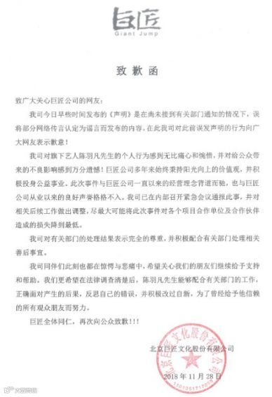 下午5时许,陈羽凡的公司“巨匠文化”再次在官方微博发文,但这次发布的是致歉函。在致歉函中,他们表示,早些时候发布的《声明》是在尚未接到有关部门通知的情况下,将部分网络传闻认定为谣言而发布的内容,对误发声明向广大网友表示歉意。而对于陈羽凡的吸毒被抓,他们表示感到无比痛心和惋惜,而公司对有关部门的处理结果表示完全尊重,积极配合处理相关善后事宜。