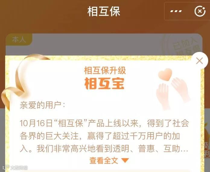据悉,定位为网络互助计划后,新「相互宝」将不再由信美人寿相互保险社承保。根据信美人寿同期发表的声明,因为其受到监管部门约谈,信美人寿不能再以「相互保」的名义继续销售其团体重症疾病保险。