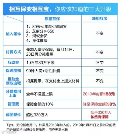 选择升级和新加入到“相互宝”中的用户,共同参与分摊。在2018年12月31日之前加入“相互宝”的用户,不管是从“相互保”升级过来,还是新加入,在2019年1月31日之前涉及的费用分摊都将由蚂蚁金服承担,用户无需出钱。