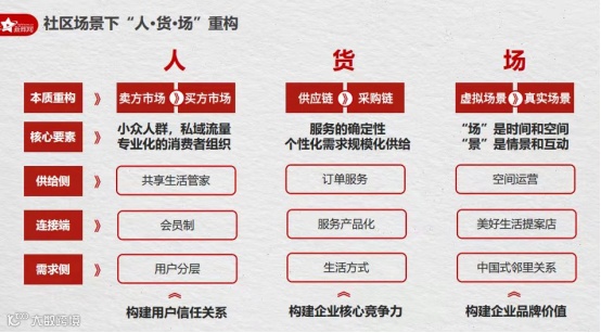 不同的行业对于“人货场”的理解也都不大一样,每个行业都有各自的理解和玩法。那么针对社区经济领域,“人货场”也有着独特的含义。