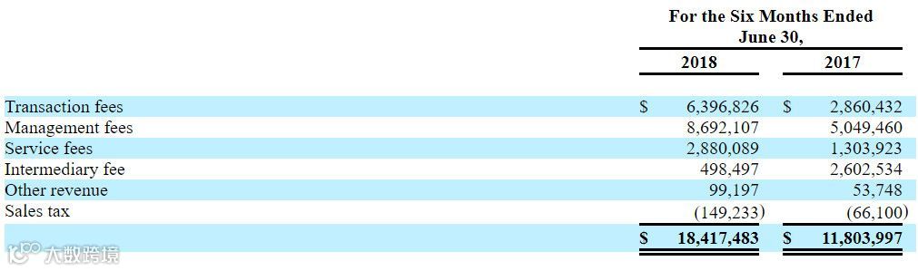 从泰然金融收入构成中可以看到,公司主要营收来源为管理费,2017年,管理费收入大约是交易费的2倍。2018年上半年,管理费收入和交易费收入差额减少至230万美元。
