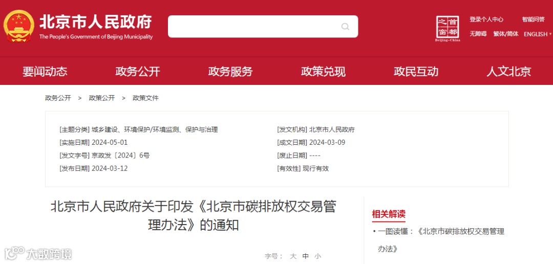 《管理办法》自2024年5月1日起施行。《北京市人民政府关于印发〈北京市碳排放权交易管理办法(试行)〉的通知》及《北京市人民政府关于调整〈北京市碳排放权交易管理办法(试行)〉重点排放单位范围的通知》同时废止。