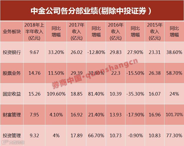 今年上半年,在行业业绩整体下滑的情况下,中金公司业绩表现亮眼。不过相比于投行业务和股票业务板块收入分别同比增长30%及10%以上,固收业务收入更是同比增长109%,财富管理分部的收入增幅仅为4.1%。