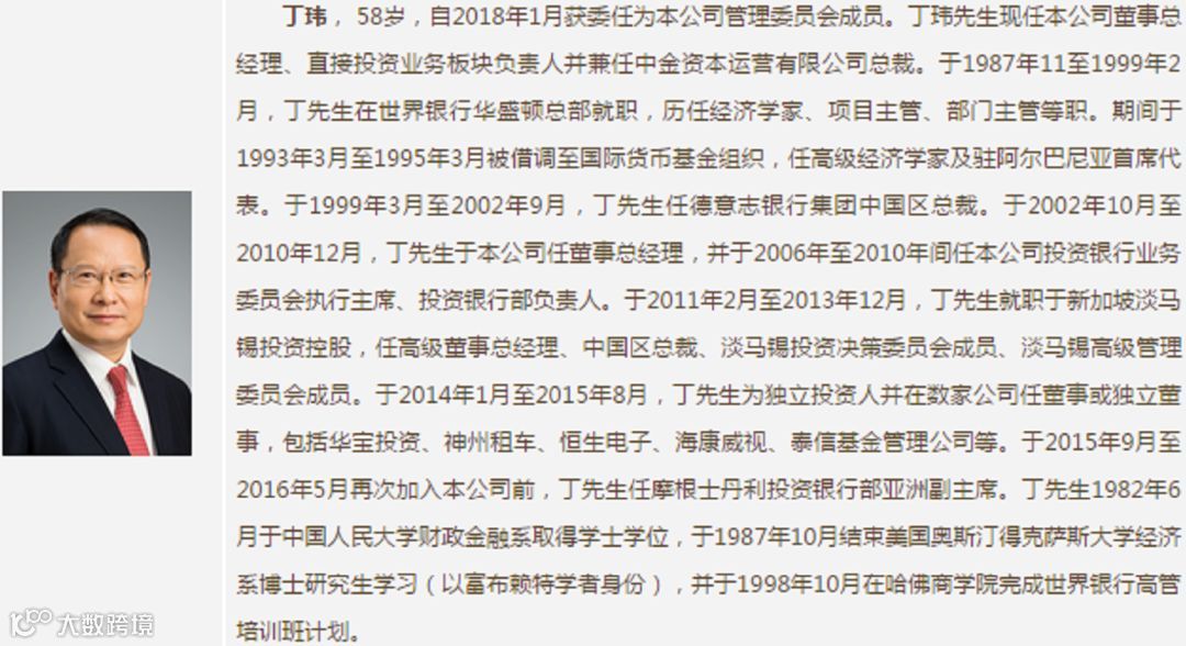 除了中金的任职经历,丁玮曾在世界银行华盛顿总部、国际货币基金组织、德意志银行集团、新加坡淡马锡投资控股等机构任职,在2016年5月再次加入中金公司前,曾在摩根士丹利担任投资银行部亚洲副主席。除此之外,丁玮曾作为独立投资人并在华宝投资、神州租车、恒生电子等数家公司担任董事或独立董事。