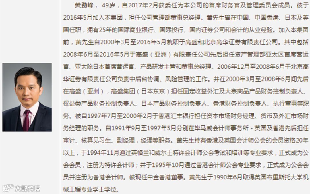 自2017年2月获委任为中金公司的首席财务官及管理委员会成员。曾在内地、日本及英国任职,拥有25年的国际商业银行、国际投行、国内证券公司和会计的从业经验。加入中金公司前,黄劲峰就职于高盛和北京高华证券有限责任公司。