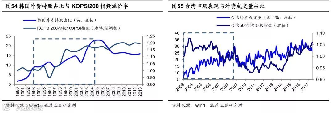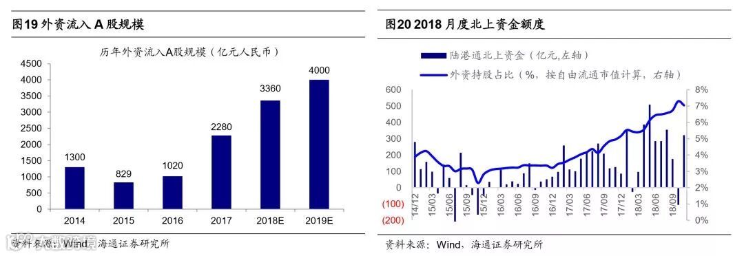 中国不断对外开放,预计2019年外资净流入A股4000亿。近几年我国人民币逐渐国际化、金融市场对外开放的力度不断加大。2016年10月人民币在正式加入SDR货币篮子,占比10.92%,成为第三大权重货币。金融市场对外开放方面,股市在2014年11月推出沪港通,2016年12月推出深港通,“沪伦通”也有望年内推出。18年6月A股正式纳入MSCI指数,9月27日全球第二大指数公司富时罗素(FTSEGEIS)也宣布将从2019年6月开始将A股纳入其全球股票指数体系。债市方面,2016年2月央行进一步放开境外机构投资者投资银行间债券市场,2017年7月债券通也正式上线。但目前外资在A股中持股比例仍然较低,根据最新央行调查统计司披露到9月底的数据测算,目前QFII和RQFII使用额度总额约为6900亿人民币,陆股通北上资金累计流入6107亿人民币,按流通市值计算A股中外资持股占比为3.4%,按自由流通市值计算A股中外资持股占比约7%,这一比例明显低于日本的30%,中国台湾的27%、韩国的16%。2018年前11个月外资流入3080亿,预计全年流入3360亿,2019年由于A股将纳入罗素富时指数,流入A股的被动资金将进一步将上升,我们测算通过MSCI与FTSE被动配置资金流入将为240亿美元,再考虑主动资金流入,预计全年流入A股外资的规模大概在4000亿人民币左右。假设自由流通市值规模不变,2019年A股外资持股比例有望上升至8.8%左右。参考台湾、韩国股市国际化的经验,台湾在2000年全面取消外资持股比例上限后,外资持股比例从2000年8.8%升至2007年25%,韩国外资持股比例从92年4%提高到2000年13.8%,台湾、韩国外资持股比例在7-8年时间里分别提高了16.2个百分点、9.8个百分点,平均提高了13个百分点。假设未来7年我国资本市场对外开放的过程中,外资持股占比(按自由流通市值计算,下同)从目前的7%提高到15%。则长期看外资有望给A股带来约2.76万亿的增量资金,按7年计平均每年约4000亿的增量资金,保守看亦有3000亿的增量资金。