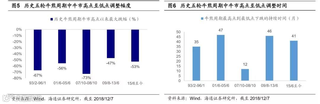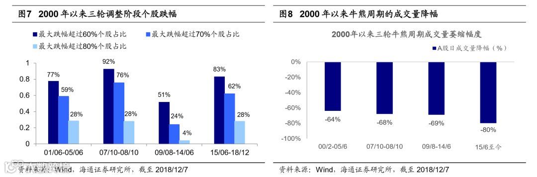 上证综指5178点来的下跌时空跟过去几次熊市相当。回顾前四次市场从牛市最高点以来调整阶段的市场表现,第一轮是1993/2/16-1996/1/19,上证综指从1558点跌至512点,跌幅67%,持续35个月;第二轮是2001/6/14-2005/6/6,上证综指从2245点跌至998点,跌幅56%,持续了47个月;第三轮是2007/10/16-2008/10/18,上证综指从6124点跌至1664点,跌幅73%,持续了12个月;第四轮是2009/8/4-2013/6/26,上证综指从3478点跌至1849点,跌幅47%,持续了46个月。从2016年1月底上证综指2638点以来,市场再次进入中长期圆弧底阶段,这轮调整从15/6/12高点5178点以来至今最大跌幅53%,截至目前已持续约41个月,指数跌幅与持续时间都已经与前4轮调整阶段相近。从成交量角度来看,2000/2-2005/6期间,A股每日成交量从2000/2最高的41亿股降至最低14.6亿股,降幅64%(这轮牛市最高点在01/6高点,但成交量最高点在2000/2);在07/10-08/10期间A股每日成交量从最高的179亿股降至最低58亿股,降幅68%;09/8-14/6期间每日成交量从最高的380亿股降至最低117亿股,降幅69%;15/6至今,每日成交量从最高的1272亿股降至最低253亿股,降幅80%。此外回顾2000年以来三轮牛熊个股股价涨跌幅,从2001年6月牛市高点到2005年6月低点,全部A股股价最大跌幅超60%的个股占比77%,2007年10月牛市高点到2008年10月低点,占比92.5%,2009年8月牛市高点到2014年6月,占比51.5%,本轮自2015年6月牛市高点算起,截止2018/12/07占比为83%,也接近前期底部水平。目前从指数跌幅、个股跌幅百分比、持续时间等等角度来看,已经与前几次市场底部相似,市场已经处于第五轮周期的底部区域。