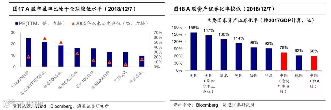 对比海外,A股吸引力很大。截至2017年,中国名义GDP达12.2万亿美元,在全球经济总量中占比15.2%,排名全球第二。根据IMF预测,到2023年我国名义GDP在全球经济总量中占比有望进一步上升至18%。从股市规模来看,A股总市值为5.6万亿美元(截至2018/12/7),全球占比7.5%,排名全球第三。加上港股中概股与美股中概股后,总市值为8.8万亿美元,占全球总市值股票总市值11.8%。从资产证券化率来看,截至12月7日我国的资产证券化率仅为60%(仅考量在A股上市的企业),即使考虑海外中资股,目前中国的证券化率也只有75%,远低于美国(147%)、日本(130%),也低于英国(114%)、法国(96%)、韩国(91%)、印度(92%)等。对比海外市场,A股已经非常有吸引力。对比全球主要市场的估值以及估值的历史分位数,万得全A目前PE(TTM)为13.1倍(处于05年以来由低到高的6%分位水平),而标普500指数为18.7倍(50%),富时100指数为16倍(13%),日经225指数为25倍(21%),印度孟买SENSEX指数为22倍(58%),A股估值处于历史低位。对比全球第一大市场美股,美股估值与盈利都处于高位,并且仍处于加息周期中,很可能已经处于牛转熊的的拐点。从估值水平看,以1954年为起点,标普500PE(TTM)(下同)均值为16.7倍,向上一倍标准差为21倍,目前标普500的PE 18.7倍已经处于历史高位。美股盈利同样处于历史高位,1954年以来标普500的EPS同比增速均值7%,向上一倍标准差为24%,而2018Q3的标普500EPS增速已经达到26%。对比同为新兴市场的印度股市,截至2018Q3,孟买SENSEX指数净利润增速为8.6%,PE(TTM)为22倍,对应PEG为2.5倍。全部A股2018Q3年净利润增速为10.4%,PE(TTM)为13.7倍,对应PEG为1.3倍,A股性价比同样较高。从新兴国家和发达国家股市的相对强弱来看,1988年以来MSCI新兴市场指数/发达国家指数平均6年一个上行/下行周期,并且与美元指数呈反方向变化。即美元指数上升,发达国家股市表现更强;美元指数回落,新兴市场指数表现较强。从2016年初以来,美元指数在88-103的区间波动,MSCI新兴市场指数/发达国家指数开始回升。如果未来美元指数不再进一步上升,新兴市场指数有望表现更强。A股作为全球第三大股市和最大的新兴市场国家股市,全球视角下吸引力提高。
