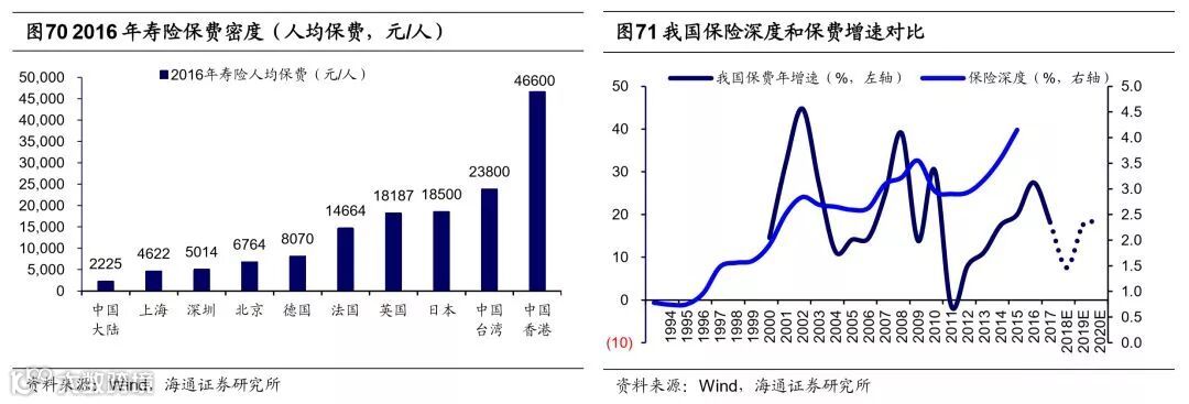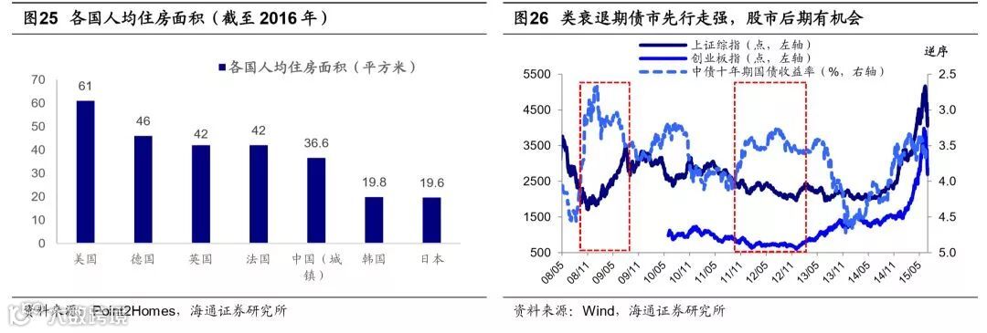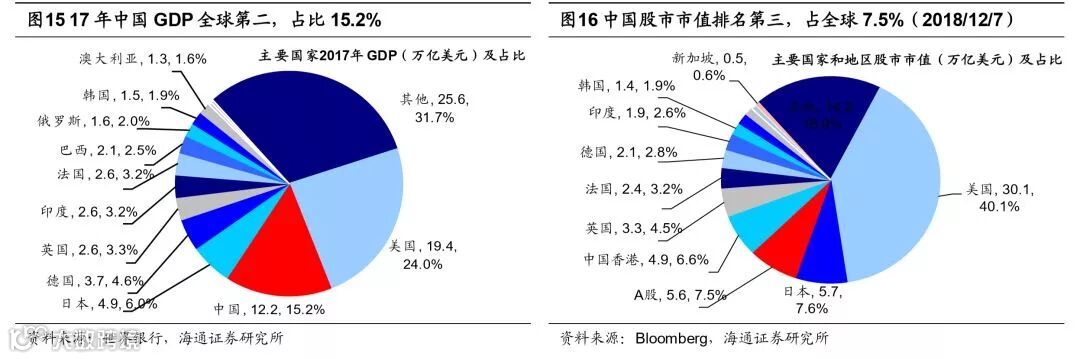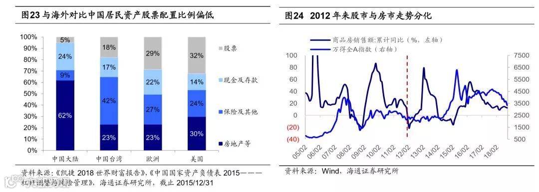 长周期看,居民资产配置将从地产到股票。居民资产配置主要是房子和股票资产,2015年中国居民资产中房地产占比高达62%,股票配置比例仅为5%,2017年美国分别为30%、32%,欧洲分别为23%、28.7%(中国数据来自《中国国家资产负债表2015———杠杆调整与风险管理》,海外数据来自《凯捷2018世界财富报告》)。回顾2000年以来的大类资产收益率,我们在报告《中美大类资产的长跑赛:股市更强-20180130》中曾分析过,测算2000-2017年期间我国大类资产的年化收益率,上海房价年化收益率达12.1%、全国商品房房价(全国房地产销售额/销售面积)为7.8%、上证综指(考虑分红)为5.8%。其中地产投资收益率较高,考虑银行按揭贷款带来大约两倍的杠杆效应,2000年以来居民投资地产收益可观。但是展望未来,我国居民的资产配置也将逐渐向成熟市场靠拢。这首先源于我国居民住房需求最旺盛的阶段已经过去。从年龄结构来看,2017年我国人口年龄中位数为37岁,而2000年我国人口年龄中位数仅30岁,人的生命行为周期理论显示,25-40岁是购房的高峰,此时地产链是增长的主要驱动力之一,现在我国已经进入后地产时代。从人均住房面积来看,截至2016年我国城镇居民人均住房面积约36.6平方米,相比于2000年我国城镇居民人均住宅面积20平方米已经大幅提高。相对于海外城市人均住宅面积,根据加拿大地产公司Point2Homes数据,美国为61平方米、德国46平方米、英国和法国42平方米、韩国19.8平方米、日本19.6平方米,我国城镇人均住宅面积接近中等水平。从产业角度来看,随着我国产业结构不断升级,我国的支柱产业将从房地产向先进制造业和现代服务业转型。产业结构升级也需要融资方式随之转变,在前期报告《金融:直接融资支持产业升级——当前中国对比1980年代美国系列(2)-20180524》我们曾分析过,在1980年代美国经济引擎由工业转型服务消费科技业时,股权融资发挥了巨大作用,主要原因是第三产业相比第二产业,其核心资产是知识产权和人力资本,没有太多可以用来抵押的固定资产,银行体系无法满足这类企业的融资要求。我国目前也处于类似美国1980年代的转型阶段,正在由传统经济转向新经济,十九大报告指出,我国要增强金融服务实体经济能力,提高直接融资比重。未来股市将得到更大的发展,A股在居民资产配置中的占比也将进一步提高。
