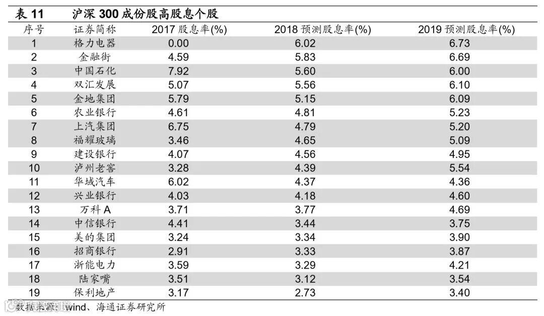 从类滞胀走向类衰退,底部打磨期重视高股息率公司。2018年下半年以来中国经济出现类滞胀特征,往后看经济下行压力较大,而通胀周期滞后于经济周期,19年经济可能出现类衰退特征。类衰退期经济增速下行,通胀下降,企业盈利恶化导致股市低迷,防御性行业优势显现。国内两次典型类衰退区间:2008/04-2009/03、2011/09-2012/09,在类衰退期政府为刺激经济,宏观政策均有宽松。08年9月央行降息降准,11月国务院推出刺激经济的四万亿投资计划。2011年12月央行三年来首次下调存款准备金率,2012年两次降息、两次降准。以宏观政策转向为界将类衰退期间分为前后两段。两次类衰退前期必需消费(食品饮料、医药等)和高股息行业(银行、保险、石油石化、电力公用等)表现较好,强周期行业表现较差(有色、钢铁等)。类衰退后期受益于宽松政策的行业表现更优,第一次类衰退后期,周期性行业受益于四万亿投资计划,2008/09-2009/03期间建材涨跌幅78.8%、电力设备78.6%、有色73.3%、同期上证综指19.5%。第二次类衰退后期金融改革持续利好,11年RQFII试点加速推行,12年A 股证券交易经手费收费标准下调,同年保监会降低中小型保险公司设立资管公司门槛,促进保险资产投资多样化。2011/12-2012/09券商涨幅11.8%,保险10.7%,同期上证综指-10.6%。此外衰退期高股息行业股价表现也很显著,比较高股息、低PE、低PB、高ROE四种策略在衰退期表现,在衰退期开始阶段选取沪深300成分股前10%个股作为组合,按市值加权,第一次类衰退期(2008/04-2009/03)高股息策略收益率-30.7%、低PE-31.0%、低PB-32.3%、高ROE-36.1%,同期沪深300指数-33.8%,第二次类衰退期(2011/09-2012/09)高股息策略收益率-8.0%、低PE-8.5%、低PB-12.9%、高ROE-22.8%,同期沪深300指数-19.4%。为何衰退期高股息策略明显占优?我们前期报告《高股息策略长期有效么?-20160920》研究过长期看高股息策略在中美股市均有效,尤其是熊市期间高股息策略充当保护伞作用,通过股利再投资积累更多的股份能够缓和组合价值下降,市场恢复后这些额外的股份也将提高组合收益率。另一方面类衰退后期宏观政策宽松,利率下行债市受益,类债券特征的高股息股票也更显投资价值。根据行业分析师预测,结合历史分红率预测股息,我们筛选沪深300成分中高股息率、稳定分红个股如表11。