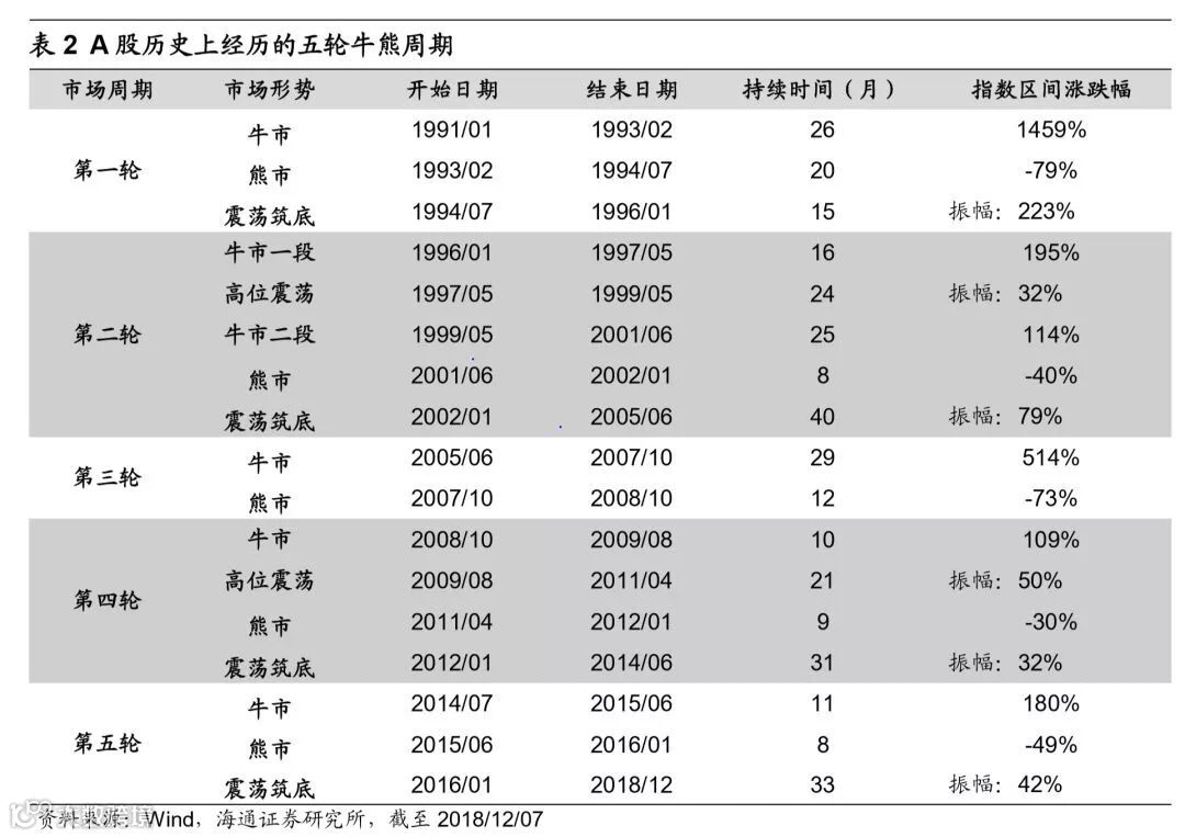 A股有史以来经历五轮牛熊周期。我们一直把市场分为三种状态:单边上涨定义为牛市,单边下跌定义为熊市,区间波动定义为震荡市,牛市不仅指数上涨还伴随着增量资金入场,熊市不仅指数下跌还伴随着资金流出,震荡市整体上指数区间波动,存量资金博弈。从1990年以来,A股已经经历了五轮“牛市-熊市-震荡市”周期不断交替的过程。第一轮牛市是1991/1-1993/2,随后在93/2-94/7进入熊市,随后在94/7-96/1震荡筑底。第二轮牛市是1996/1-2001/6(中间包含了97/5-99/5持续24个月的高位震荡),01/6-02/1是熊市,02/1-05/6震荡筑底,其中04/4-05/6市场经历了震荡筑底的尾部最后一跌。第三轮牛市是2005/6-2007/10,随后07/10-08/10进入熊市,这次市场大幅下跌之后没有经历底部震荡,而是直接从08年10月28日开始快速上涨。第四轮牛市是2008/10-2009/8,随后在09/8-11/4期间市场高位震荡,11/4-12/1期间市场进入熊市,之后12/1-14/6期间市场震荡筑底。第五轮牛市是2014/7-2015/6,经历了15/6-16/1期间的三轮大跌之后,从16/1的上证综指2638点至今市场处于震荡筑底阶段。