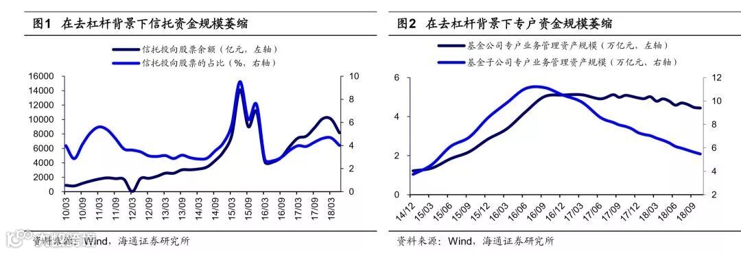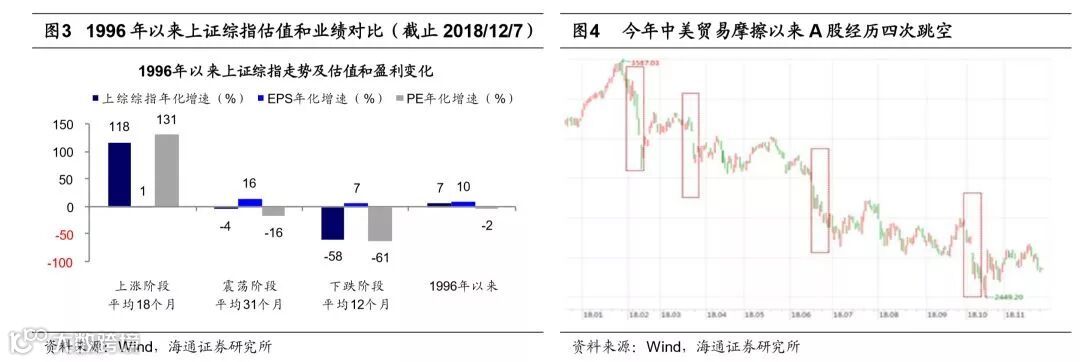 杀估值源于去杠杆导致资金面偏紧、中美关系恶化诱发悲观预期。按照DDM模型,影响股价的三要素是盈利增长、无风险利率和投资者风险偏好。今年以来A股盈利增速虽然有所放缓,但是仍保持两位数增长,导致A股下跌的主因是股市资金面偏紧和投资者风险偏好降低。2018年4月27日,央行联合两会、外汇管理局发布《关于规范金融机构资管管理业务的指导意见(征求意见稿)》,2018年7月20日,银保监会公布《商业银行理财业务监督管理办法(征求意见稿)》,内容与资管新规一致。在去杠杆大背景下,股市资金面出现明显分化,即外资加速流入而内资规模缩减。截止2018/12/07,今年陆股通北上资金净流入2907亿元,而2017、2016年分别为1997、607亿元,外资持续流入。国内机构投资者撤离源于在资管新规出台后,配套理财细则未落地,导致银行存量资产萎缩的同时,新发产品受限,进而引致包括基金专户、私募、信托等相关权益资金撤出,基金公司专户规模从2017年11月高点5.04万亿降至2018年10月的4.44万亿,基金子公司专户从7.63万亿降至5.48万亿,信托投向股票规模从17Q4的高点1.01万亿降至18Q2的0.82万亿,私募投资基金规模从18Q1高点2.58万亿降至18Q3的2.39万亿。今年上证综指从1月29日3587点高点到10月19日2449点低点,最大跌幅1138点,期间出现四次跳空缺口,缺口合计601点,占跌幅近一半。其中两次与美股短期急跌有关,两次与中美贸易摩擦升级有关,中美贸易摩擦及中美关系是影响市场情绪的重要变量。美国时间3月22日美国总统特朗普签署总统备忘录,将根据“301调查”对中国进口商品大规模征收关税,本轮中美贸易摩擦开始升级,此后3月23日上证综指单日跌-3.4%。美国时间6月15日美国政府发布了加征关税的商品清单,将对从中国进口的约500亿美元商品加征25%的关税,此后6月20日上证综指单日跌-3.8%。2月初、10月初美股短期跳空拖累A股表现,2月5日标普500单日跌幅达-4.1%,上证综指2月9日跳空-4.1%,10月10日标普500单日跌幅达-3.3%,10月11日A股跳空-5.2%。