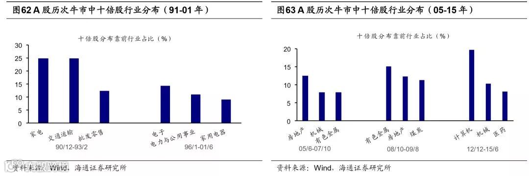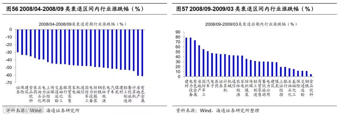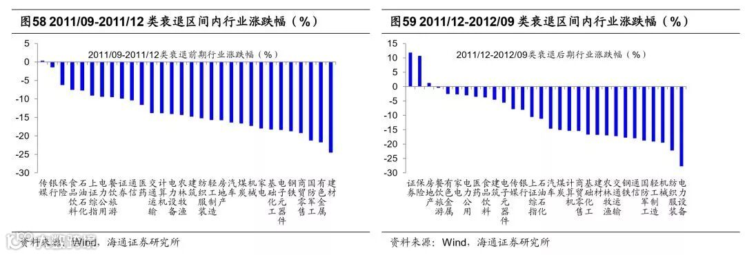 短周期投资时钟看,衰退后期股市开始表现。按照“美林时钟”的分析框架,经济周期每一个阶段对应着表现超过大市的某一特定资产类别:债券(衰退期)、股票(复苏期)、商品(过热期)、现金(滞胀期)。统计中国2001-2017年不同经济周期大类资产表现,滞胀期现金>债券>商品>股票,衰退期债券>现金>股票>商品,复苏期商品>股票>债券>现金,过热期股票>商品>现金>债券。2018年下半年经济呈现类滞胀特征,我国GDP当季同比增速由18Q2 6.7%降至18Q3 6.5%,6月以来CPI同比增速连续上升,10月为2.5%。往后看经济可能从类滞胀走向类衰退,首先经济仍面临较大下行压力,美国对2000亿美元的中国产品加征关税税率将在2019年1月1日提高至25%,对19年出口产生较大冲击。国内投资方面,18年10月地产投资增速仍保持9.7%,19年也存在下行压力。而通胀周期通常滞后于经济周期,CPI同比增速滞后于GDP回落,19年通胀也可能随之下行,经济呈现类衰退特征。衰退期政府为刺激经济往往推出宽松宏观政策,利率下行,债市开始表现,随后宽松的宏观政策逐步落实,市场对经济下行的悲观预期开始修复,企业盈利也开始逐步企稳,股市机会显现。历史上典型的类衰退区间(08/4-09/3、11/9-12/9月)均是如此,08年为应对金融危机,08年9月央行宣布降息降准,11月国务院常委会议推出刺激经济的四万亿投资计划,十年期国债收益率从08年8月4.56%降至09年1月2.67%,08年10月底上证综指触底1664点,之后开启新一轮市,最高涨至09年8月3478点。11/9-12/9类衰退期十年期国债收益率从11年9月4.13%降至12年1月3.40%,上证综指先是在12/1-12/2有一波16%的反弹,此后在12/12-13/2有一波20%的反弹,创业板指则在12年12月初触底585点,此后开启了13-15年大牛市。