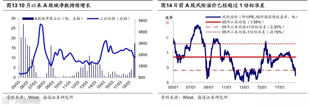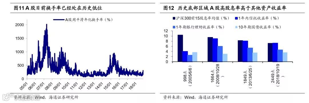 情绪指标和大类资产比价佐证估值底。情绪指标显示目前市场风险溢价、换手率、个股破净数与跌幅也接近前期底部水平。我们以1/全部A股PE-10年期国债到期收益率作为股市风险溢价的衡量指标,2005年以来的历史数据显示这一指标存在明显的均值回归特征,上证综指2449点时风险溢价为3.9%,远高于2005年以来的均值1.58%,接近2005年以来均值+1倍标准差即3.35%。而回顾前几轮市场底部,2005/6/6的998点市场风险溢价为1.71%,2008/10/28的1664点为4.16%,2013/6/25的1849点为4.74%。从换手率看,目前(2018/10/19,下同)A股年化周平滑换手率为153%,前四次市场底A股换手率分别为204%、290%、172%、259%(2016/1/27)。历史上,在市场底部区域A股破净股数量往往剧增,比如05Q2破净数占比为20.2%,08Q4为16.7%,13Q2为10.9%,16Q1为2.9%。今年三季度至10月19日A股破净数(区间最低价/每股净资产<1)达到525家,占全部A股的14.8%,也接近前几次底部区域水平。从两融交易额占A股成交额比重看,目前A股为7.4%,已低于2013年6月1849点前后的8.2%。从大类资产配置角度看,股市在底部区域较其他大类资产显现更优的性价比,2005年以来三次底部沪深300成分股股息率最高的15只个股过去12个月股息率均值分别为10.4%、9.5%、8.4%,超过信托、银行和国债。当前也不例外,目前上证综指2449低点(2018/10/19,下同)沪深300前15只股息率最高的股票股息率均值为7.2%,1年期信托收益率为7.2%,1年期银行理财收益率为4.6%,10年期国债收益率为3.6%。