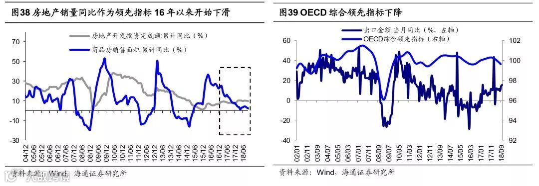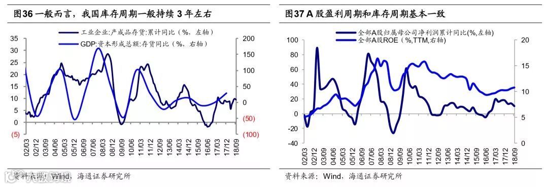 时间上来看盈利回落将持续到19Q3,或许会更长。当前市场政策已经开始变化,但盈利下降的趋势依然没变,盈利下行究竟会延续到什么时候呢?回顾历史,2002年以来A股经历了5轮盈利周期,平均每轮盈利周期持续12个季度,5轮盈利起落周期分别为02Q3-05Q4、06Q1-08Q4、09Q1-12Q2、12Q3-16Q2、16Q2-至今,目前A股处在第5轮盈利周期的回落期。本轮盈利周期始于2016年中,A股净利累计同比从16Q2的-4.7%升至2017年底的18.1%,ROE(TTM,下同)从9.4%升至10.3%,2018年以来净利润同比增速开始下滑,至18Q3为10.4%,ROE为10.8%。观察2002年以来我国经济的库存周期和A股的盈利周期,可以发现两者走势大致趋同,而且两者周期平均都为三年左右。分别用GDP中资本形成总额分项存货同比和工业企业产成品存货累计同比衡量存货,可发现自2002年以来我国已经历5轮库存周期,平均持续39个月,其中补库存和去库存各占1年半左右。本轮库存周期始于2016年中,自18年二季度步入去库存阶段,按照历史经验,本轮库存周期将于2019年三季度左右结束。当然,本轮库存周期可能面临更多不确定性,中美贸易摩擦悬而未决,若未来我国出口增速大幅下降,本轮库存周期或将延长。从具体数据来看,房地产销售面积累计同比已经从16年初的36.5%下降到18年10月的4.1%,而地产销售领先地产开工领先地产投资,回顾历史发现地产销售通常领先地产投资6-12个月。OECD综合领先指标从18年初的100.3下降到99.6,OECD综合领先指标通常领先出口同比增速1-3个月,需求端回落的趋势很明确。考虑到我国库存周期和A股盈利周期大致走势趋同,目前A股盈利也仍在下行通道中,业绩将在明年三季度或更长的时间探底。