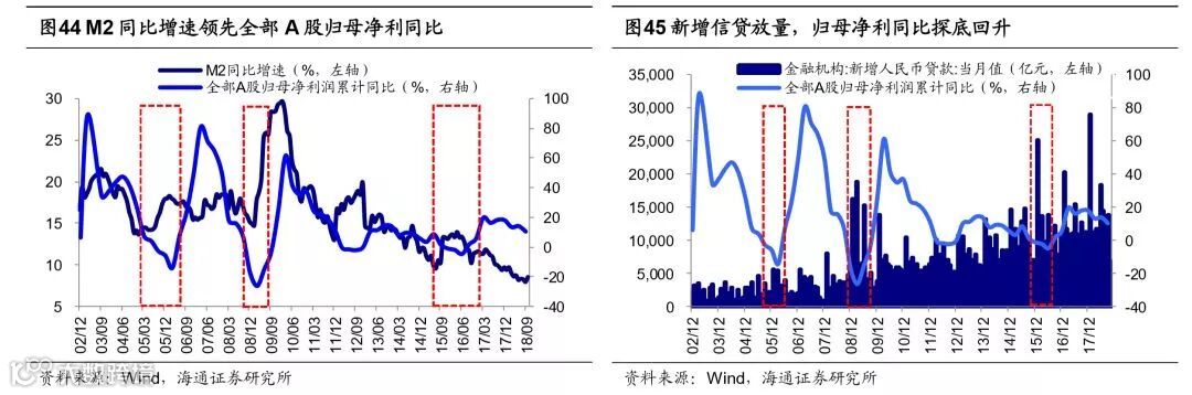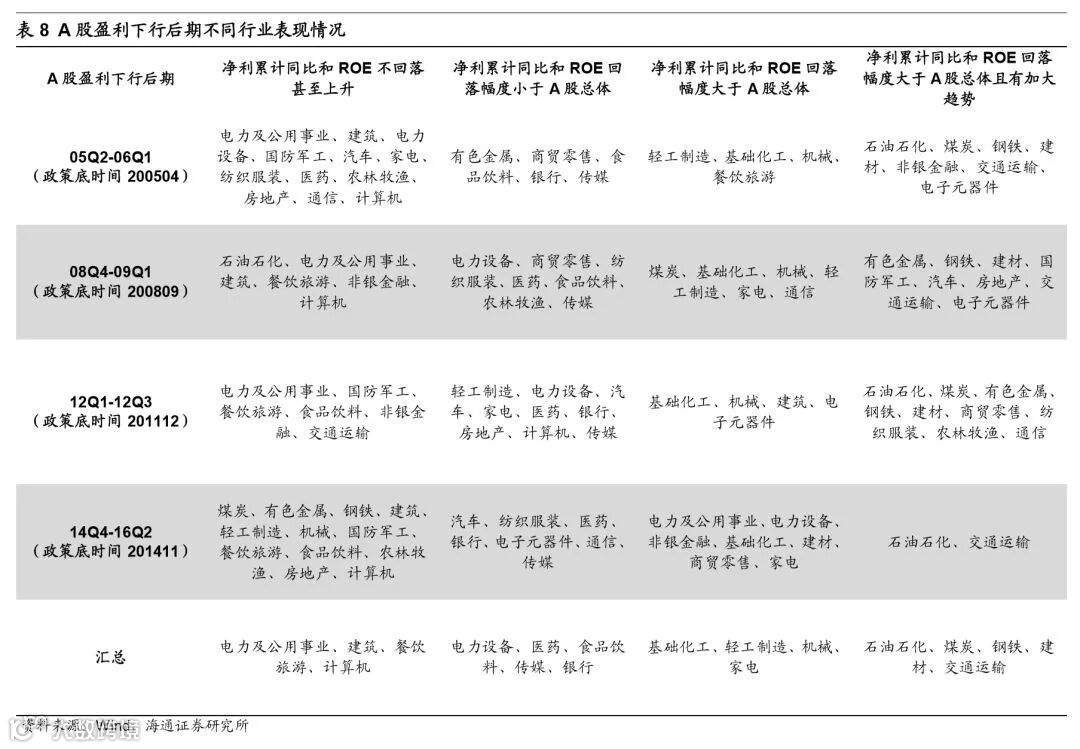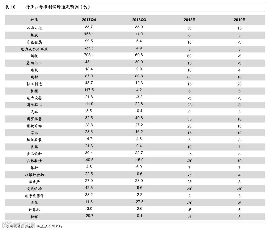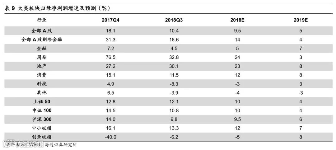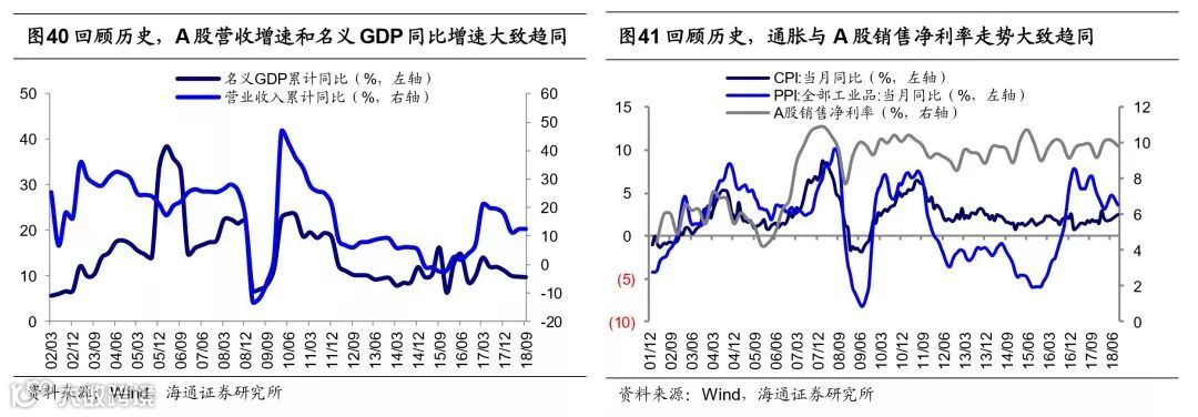 空间上盈利正增长面临考验,预计19年净利同比为5%。目前我国经济呈现类滞涨特征,GDP当季同比由18Q2的6.7%降至18Q3的6.5%,CPI同比从5月1.8%升至10月2.5%,往后看经济增速下行趋势不变,通胀周期滞后于经济周期,预计未来经济将由类滞胀走向类衰退,对应到微观层面就是从量跌价稳到量价齐跌。量的角度看,2000年以来A股总营收同比与名义GDP增速走势趋同,但盈利下行后期增速差距更大,2010年以来盈利下行后期两者平均相差5.5个百分点。根据海通宏观预测2019年中国名义GDP将回落至8%,以此推算2019年A股营收同比为2.5%。价的角度看,2000年以来A股销售净利率走势与通胀大致趋同,在通胀下行期CPI和PPI下行1个百分点对应销售净利率平均回落0.1个百分点。根据海通宏观预测2019年A股CPI、PPI分别为2%、0 %,那么从17Q3以来CPI、PPI下降了-0.4、6.9个百分点,对应2019年销售净利率回落至9.6%。此外,税制改革将对冲业绩下滑趋势,目前个税改革已出台,按照2015-17年城镇居民消费/可支配收入均值为0.68,推算个税改革将提高A股净利同比0.2个百分点,其他值得期待的改革方向是增值税改革、降低社保缴费比例,预计在大力度/温和改革下减少增值税457/242亿元,提高2019年A股净利同比0.9/0.5个百分点,减少社保缴费379/183亿元,提高2019年A股净利同比0.7/0.3个百分点。综上,我们预测2019年A股净利同比在5%左右,对应ROE为9%左右。另外,前文分析到A股盈利预计将在19年Q3见底,回顾历史上几次盈利周期低点时净利同比都破零,而当前新时代产业结构转型和行业集中度提升都利于抬升业绩增速中枢,我们认为这次A股净利同比低点将在零增长附近。