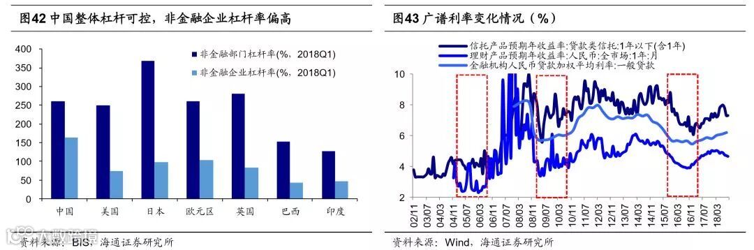 这一次政策效果需要等待信用宽松信号,及减税措施落地。从价的角度看,银行间回购利率已经明显回落,但以贷款类信托产品利率、人民币理财产品收益率以及人民币贷款加权平均利率为代表的广谱利率依然处于较高位。从量的角度看,M2同比增速依然在下行,新增信贷未放量。所以我们需要继续观察未来政策继续推行的情况,看效果是否落到实处。如果经济增速进一步回落,未来政策有望进一步加码,如继续降准、降息、适当放松房地产政策等,此外减税降费等改革措施也有望加速推进。这次“宽货币紧信用”情况的出现本质上是由去杠杆导致的,BIS数据显示2018Q1我国整体杠杆率261.2%,低于日本368.7%、英国279.9%,与欧元区260.0%、美国250.5%接近。总量看我国目前杠杆率不算高,但结构性问题显著,非金融企业部门杠杆率明显偏高,我国164.1%,欧元区103.8%、日本98.9%、英国83.9%、美国73.5%。杠杆结构的问题限制了银行的信用扩张,目前需要进一步确认政府的隐性债务,等待地方政府隐性债务的解决方案,预计要等到2019年两会后。上世纪90年代中期,国企部门在银行过度放贷下背负高杠杆,1999-2003年政府通过政企分开、兼并重组等方式进行国企改革,当时去杠杆的标志性事件是成立四大国有资产管理公司,对银行资产负债表进行重组,剥离银行不良资产,之后M2同比和贷款余额增速明显回升。此外减税方面,目前已经明确的财税改革方向包括个税改革,值得期待的改革方向是增值税改革、降低社保缴费比例,减税措施的落地可以帮助企业尤其是民企降低成本改善盈利。