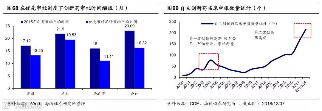 服务消费:医疗健康、保险。中期看,目前我国医疗卫生投入不足,加之未来我国居民消费升级和老龄化程度加深将进一步加大对医疗服务需求。短期看,我国医药业是仿创并重的行业,一致性评价督促仿制药优胜劣汰,优先评审提升新药审批效率,医疗服务行业稳定增长,其中龙头的马太效应明显。根据ASCO报告,2016年我国人均仿制药费用/人均GDP为48%,美国为14%,英国为14%,印度为33%,中国仿制药费用负担明显较重。然而,从2015年开始,医保控费、招标降价、审评提速等政策多管齐下,制药工业增速换挡,国内仿制药企增长压力不断加大。2016年3月5日,CFDA转发了国务院办公厅发布的《关于开展仿制药质量和疗效一致性评价的意见》,意味着一致性评价已正式启动,这使得仿制药面临更艰难的生存环境,迫使药企加大研发投入,更看好高壁垒的仿制药企。未来产业核心将从仿制药向创新药逐渐过渡,2017年12月28日,CFDA(国家食品药品监督管理总局)发布《总局关于鼓励药品创新实行 优先审评审批的意见》,工作重心从解决药品注册申请积压转向鼓励创新。从创新药临床进展看,预计2018-2020年期间,我国将实现15-20个自主创新药陆续获批上市,3年的密集收获期开启国内创新药产业高潮。医疗服务行业稳定增长,2017年我国卫生总费用同比增11%,龙头公司如爱尔眼科和美年健康表现更优。目前医药PE(TTM,整体法)为28.4倍(截止2018/12/07),预计2018、2019年净利同比为10%、7%。近几年我国保险行业处于高速发展时期,2015-17年保费年均复合增速达到16.5%,但对比国际我国保险密度和深度较低,2016年我国保险深度(保费/GDP)/保险密度(人均保费)为4.15%/2241元,德国为6.18%/17279元,英国为10.1%/27007元,法国为9.36%/22844元(按照当年末汇率)。而且2017年我国人口年龄中位数为37岁,而根据日本等经验人口年龄中位数处在35-40岁是保费高速增长期,我国保险业大有可为。结构上,2017 年我国寿险、健康险、意外险占人身险保费收入的比例分别为 80%、16%和 4%。其中,健康险保费(剔除和谐健康)同比增长 36%,大幅高于寿险(23%)和意外险(21%),健康险等长期保障型业务也是当前上市险企的发展重点。随着消费升级和居民保障意识增强,我们认为保费将具有长期增长空间,预计2018、2019、2020年我国保费增速为7.55%、17.66%、18.06%。目前上市险企利润与EV均已进入了确定性较强的中长期增长阶段,“利差改善+价值转型+集中度提升”的逻辑不变,保险公司的P/EV估值水平长期看应该提升。目前保险PE/V为0.9(截止2018/12/07)倍,预计2018、2019年净利同比为8%、10%。