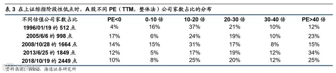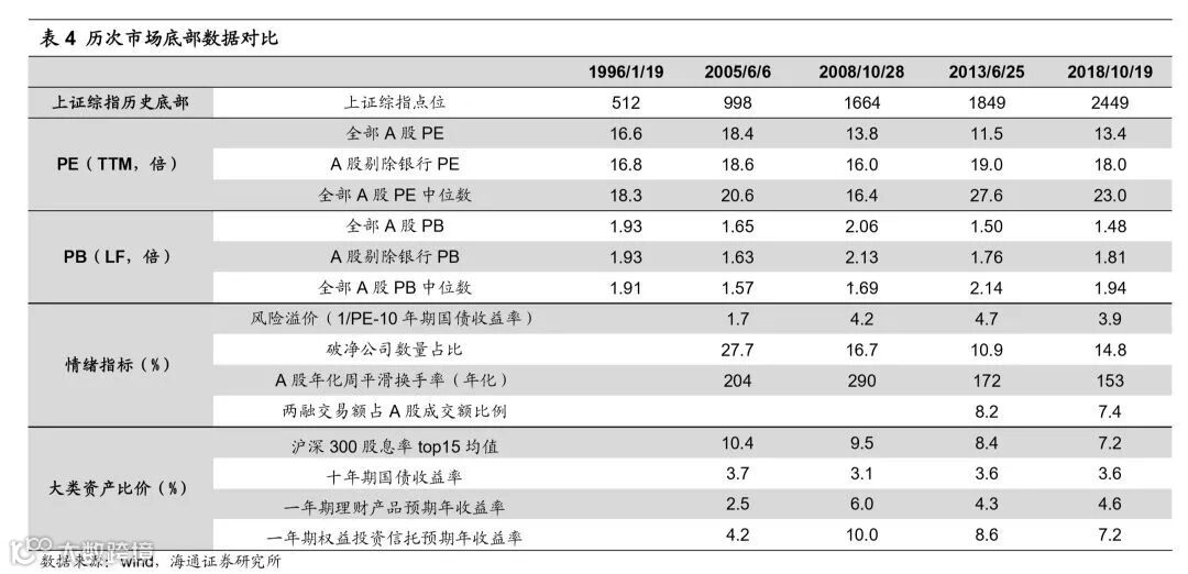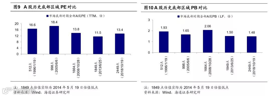 目前估值处于历史底部区域的偏低水平,且结构较优。基于绝对估值,全部A股、剔除银行A股、全部A股中位数三个角度均显示当前A股估值已与历次熊市底部水平相差无几。1990年以来A股经历了五轮牛熊周期,用上证综指刻画,对比过去几次市场底部,1996年1月19日上证综指512点、2005年6月6日998点、2008年10月28日1664点、2013年6月25日1849点,前四次市场底部全部A股PE(TTM,整体法,下同)为11.5-18.4倍,PB(LF,整体法,下同)为1.48-2.06倍,前期低点上证综指2449点(2018/10/19,下同)是分别为13.4倍、1.48倍,已经处于底部区域下轨附近。剔除银行的A股口径,前四次底部PE为16.0-19.0倍、PB为1.63-2.13倍,上证综指2449点时为18.0倍、1.81倍,处于底部区间的偏低位置。再看全部A股中位数口径,前四次市场底部PE为16.4-27.6倍、PB为1.57-2.14倍,上证综指2449点时为23.0倍、1.94倍,同样处于底部区间的中等位置。从估值分布看,上证综指2449点时上市公司PE分布与2013年6月25日1849点类似,PE处在0-10倍的家数占比为8%、10-20倍为25%、20-30倍为20%、30-40倍为12%、40倍以上为25%、负值为10%,1849点时分别为5%、17%、19%、12%、34%、12%。这样的估值结构意味着市场里有53%的股票PE位于0-30倍区间,比较前几轮市场底部,2005/6/6的998点PE位于0-30倍区间的股票有49%,2008/10/28的1664点有63%,2013/6/25的1849点有41%,这样的估值结构使得市场有一个相对稳定扎实的底部。