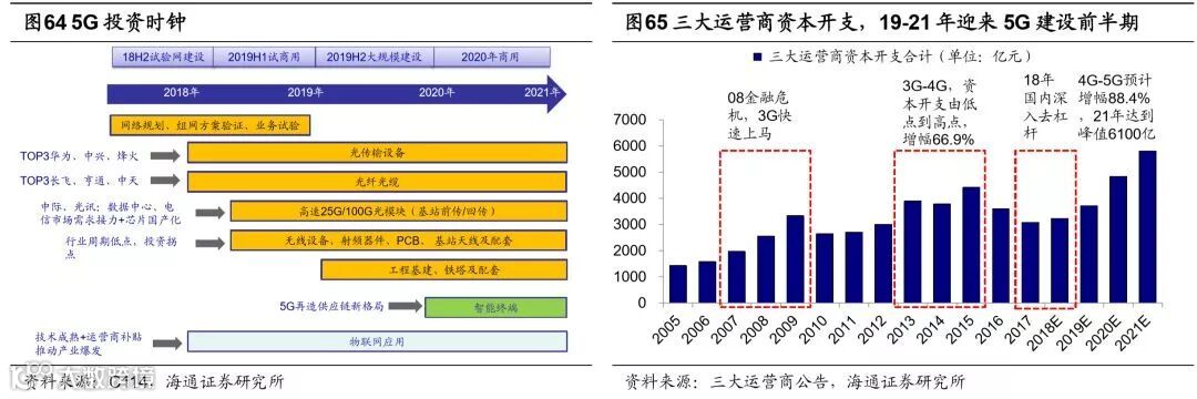 先进制造:5G产业链、新能源车产业链。先进制造业中5G、新能源车业绩增长更确定。第一,5G商用渐行渐近,通信产业将迎来新变革。5G是十三五规划、《中国制造2025》、“宽带中国”战略和“互联网+”计划的重要基础设施。从2G到4G属于效率和安全性的进步,而5G是将通信扩展到万物连接,它将面向未来VR/AR、智慧城市、工业互联网、无人驾驶等诸多领域。2017年8月,国务院印发《关于进一步扩大和升级信息消费持续释放内需潜力的指导意见》,提出力争2020年启动5G商用。在2018年6月MWC中国分会上,三大运营商均表示在2019年实现5G预商用,2020年全面商用,华为、vivo、OPPO均宣布2019年发布5G手机。5G将撬动万亿市场,2017年IMT-2020(5G)峰会预计:2030年,5G将直接/间接带动我国经济产出6.3/10.6万亿元、经济增加值2.9/3.6万亿元、就业机会800/1150万个。参照国外3G/4G的建设周期,2019-2023年我国将迎来5G建设周期,预计2019年启动小规模建设,理论上投资规模将远超4G。基于5G全网覆盖假设,预计三大运营商将建设600万个5G基站,对应潜在网络设备投资规模1.2万亿元,其中9000亿用于无线设备投资(假设单个基站均价15万元),3000亿用于有线设备投资(按经验两者3:1)。行业分析师预测5G板块扣除异常数据18/19年净利润同比增速分别为15%/20%。第二,新能源车不断普及,已成先进制造核心方向。政策方面,2009年至今,产业政策已逐步从单纯的按车型补贴,向多元全面、科学的政策引导转变:①逐步退坡补贴金额、提高获补门槛;②对产业链中电池、充电设施等进行支持。现阶段,除约定持续至2020年前的补贴政策外,2018年4月1日起,我国正式实施乘用车双积分政策,通过积分交易的市场化方式,有效衔接补贴退坡,利于产业长期发展。规模方面,2018年1-10月我国新能源汽车产、销量87.9/86万辆,同比增长70%/75.6%;根据国务院印发的《节能与新能源汽车产业发展规划(2012-2020年)》,到2020年,我国纯电动汽车和插电式混合动力汽车生产能力将达200万辆、累计产销量将超过500万辆,市场空间巨大。展望19年双积分首次考核,新能源汽车产业将进入“双积分”+“补贴”+“市场”三轮驱动时代,油耗积分以及新能源积分将促使合资及外资车企加速推出电动化车型,带动行业增量,外资车型的推出也将引领国内车型的进一步升级换代,更多催化市场需求。配套产业方面,三元锂电的能量密度提升空间更高,是动力电池发展方向,新能源汽车的普及也将拉动锂、钴原材料需求的快速增长。行业分析师预测新能源车18/19年销量同比48%/35%,板块净利润同比增速分别为30%/20%。