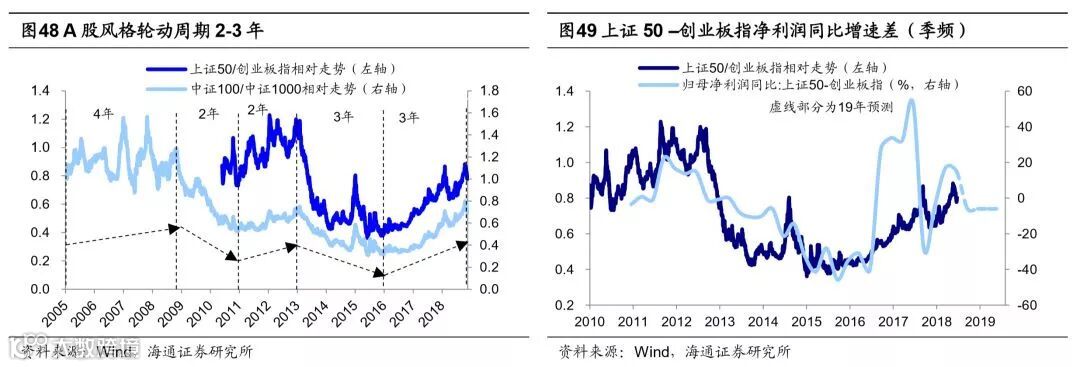 2-3年中期视角,成长风格更优。A股价值成长风格切换周期是2-3年,16-17年价值胜出,18年两个关系弱化,往后看2-3年成长胜出概率更大。从估值盈利匹配度看,价值龙头的代表上证50 PE(TTM)9.2倍(截止2018/12/07),18Q3净利润同比10.9%,我们预计18、19年净利同比10%、4%;中证100 PE(TTM)10倍,18Q3 净利润同比10.8%,预计18、19年净利同比10%、4%。成长龙头的代表创业板指 PE(TTM)30倍,18Q3 净利润同比-6.2%,预计18、19年净利同比-5%、8%。从相对估值看,上证50/创业板指PE目前为0.31,高于2010年以来均值0.21以及16年1月以来均值0.25,处于16年以来高位,而相对估值处于某一区间极值往往容易促成风格切换。从产业政策看,2015年底提出的供给侧结构性改革,过去2年主要聚焦“三去”和“一降”,周期性行业产能出清盈利改善,而为周期性行业集中授信的银行不良率也出现回落,从风格角度看,以上证50为代表的价值股业绩改善最为显著。未来将侧重“一补”,成长性较强的先进制造业和新兴消费是需要补的短板。从近期政策推进看,10月底中央政治局会议提出坚持“两个毫不动摇”,研究解决民营企业、中小企业发展中遇到的困难,11月国家领导人在上海提出将在上海证券交易所设立科创板并试点注册制,近期证监会也连续出台政策简化预案披露要求,鼓励支持并购重组,预计19年将有更多政策推进创新成长,从而加速成长股业绩释放。13-15年创业板牛市的一个重要背景就是14年初并购重组相关政策逐渐放宽,外延式并购助推了创业板盈利增速上行。展望19年,部分成长类子行业业绩增速望出现趋势性回升。