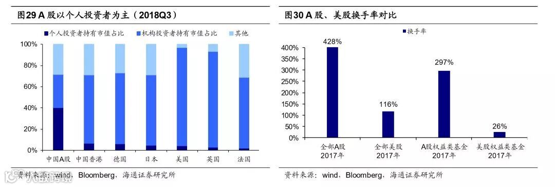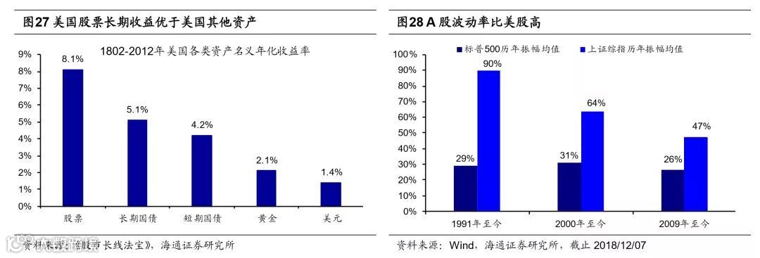 股市长期收益率高,A股只是波动大。股票相比于其他的大类资产,在长周期下的性价比更高。以美股为例,根据《股市长线法宝》,考虑利息再投资的情况下1802-2012年美国股票、长期国债、短期国债、黄金、美元的名义年化收益率分别为8.1%、5.1%、4.2%、2.1%、1.4%,美股长期收益率远超其他资产。以收益率的标准差来衡量风险,持有期为20年的股票、债券、短期国债的标准差分别为0.025、0.030、0.025,持有期20年以上的股票风险更低,因此从美股经验来看,投资期越长,股票的性价比越高。在2000-2017年期间股市(每年年初等额买入全全部A股)、房地产、股市(上证综指考虑分红)、大宗商品、债市名义年化收益率分别为13.2%,7.8%、5.8%、3.6%、3.4%,股市长期收益率也很高,只是A股还很年轻,波动很大。我们在《A股与美股的市场结构对比-20181108》与《股市:从交易型市场到配置型市场——当前中国对比1980年代美国系列(3)-20180529》中指出A股还是一个交易型市场,特征一是波动率大,1991年至今年度平均振幅为90%,同期美股只有29%;二是换手率高,2017年全部A股的换手率为428%,远高于美股116%的换手率,其中A股权益类公募基金的年度换手率为297%,也远高于美股权益类基金26%的换手率。导致A股高波动率高换手率的主要原因一是股市中机构投资者的占比少,18Q3 A股机构投资者持股市值占比为31.9%,远低于美股的93.0%,31.9%的占比大致是美股1970年代的水平。另一个原因是A股中配置型资金的占比少,2017年我国跟踪指数的基金(被动指数型+ETF)规模占权益类基金比重为28%,仅相当于美股十年前的水平,2017年美国偏股型基金中跟踪指数的基金(被动指数型+ETF)规模占比为44%,即市场中有接近一半的资金是被动配置在股市上的。