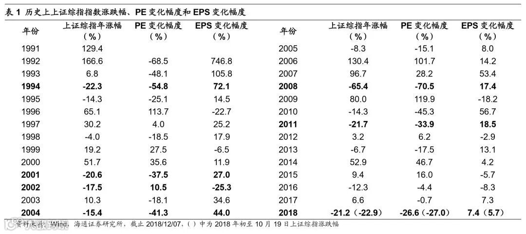 18年A股跌幅一度达历史次高,下跌主要源于杀估值。今年以来市场震荡下跌,截至2018/12/7,上证综指累计跌幅为-21.2%,特别是在10月19日上证综指2449点时累计跌幅达-22.9%,当时跌幅为年度累计跌幅的历史次新高。回顾历史熊市年份,1994年上证综指涨跌幅为-22.3%,2001年为-20.6%,2004年为-15.4%,2008年为-65.4%,2011年为-21.7%,可见今年市场回调力度不小。根据约翰·博格在《长赢投资》,股票收益分为投资收益和投机收益,其中投资收益由股息收益和收益增长构成,对应企业的盈利能力,投机收益由市盈率变动构成,对应企业的估值变化,今年以来上证综指EPS变化幅度为7.4%,PE(TTM,整体法,下同)为-26.6%,A股下跌主要是杀估值,而非杀业绩(截至2018/12/07,下同)。进一步回顾中美股市历史中盈利和估值对股价的贡献度,可以发现股市收益长期靠盈利,但A股牛市大涨和熊市大跌时估值波动大。1996年以来上证综指指数年化涨幅为7.2%,EPS为9.7%,PE为-2.3%,而1929年以来标普500指数年化涨幅为5.3%,EPS为5.2%,PE为0.1%,中美股市中盈利均是驱动股价上涨的核心动力。1996年以来A股经历了4轮牛市,分别为1996/1-2001/6、2005/6-2007/10、2008/10-2009/8、2014/7-2015/6,期间上证综指年化涨幅为118.1%,EPS为1.5%、PE为131.1%,估值比业绩对股价的贡献大。同期,A股也经历了4轮熊市,分别为2001/6-2002/1、2007/10-2008/10、2011/4-2012/1、2015/6-2016/1,期间上证综指指数年化增速为-58.3%,EPS为6.6%,PE为-60.9%,估值比业绩对股价的拖累大。虽然长期看盈利是A股的主角,但是在牛熊市中A股盈利对股价贡献较小,估值变化对股价影响力更大。