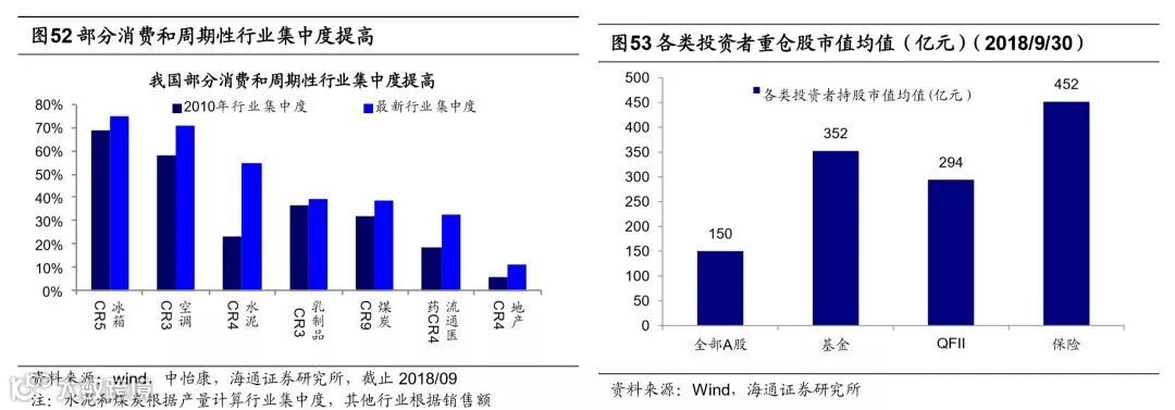 行业集中度提升与投资者结构机构化将强化龙头效应。展望2019年龙头效应仍将继续强化,第一个原因是是行业集中度提升过程中龙头盈利更优。经济由大到强阶段,行业扩容空间收窄,技术、渠道成本、环保等因素使得行业进入壁垒提高,部分产能过剩,小企业淘汰,成熟期大厂商彼此势均力敌,更多通过提高质量和改善性能来增强竞争力,这一阶段消费者收入提升对消费品质更加注重,消费升级促使本土品牌崛起。从数据看2010年以来消费类和投资类行业集中度逐步提升,包括白酒、乳制品、医药流通、空调、冰箱、洗衣机、水泥、地产、煤炭等。具体来看消费类行业冰箱CR5(销售额)从2011年的68.9%升至2017年的79.7%,空调CR3(销售额)从57.6%提升至72.0%,周期类行业如煤炭CR9(产量)从2010年的32.1%升至2017年38.3%,钢铁CR4(产量)从2014年的19.5%升至2017年21.7%等。由于龙头公司资金实力雄厚和管理经验丰富,它们往往能较好控制成本和实现销售,在行业集中度提升过程中盈利能力超越市场整体水平。龙头公司盈利更优为龙头效应打下坚实的基本面基础。第二个原因是机构投资者占比提升助于强化龙头效应。参考韩国市场、中国台湾市场的历史经验,韩国外资持股占比提升最快的时期是1997-2005年,这时期韩国外资持股占比从9%提高到23%。在韩国外资持股比例不断上升的时期,KOSPI200指数(韩国大盘蓝筹指数)/KOSPI指数的相对溢价从1.0提高到1.2。从台湾经验来看,2003-2008年期间台湾外资持股比例从11%提高到25.8%,外资成交额占比从13.8%提高到约30%,这时期内代表大盘蓝筹股的台湾50指数相对于台湾加权指数溢价率在1以上,台湾50指数表现相对较强。从A股数据看,2015年至今A股散户投资者自由流通市值持股占比总体呈下降趋势,从49%下降到2018Q3的40.4%,而内外资机构持股占比从23.8%提高到31.9%,散户占比下降,机构占比上升的长期趋势较为明显。边际增量资金影响市场风格,相对于散户,机构投资者更偏好低估值、大市值的龙头企业。基金、QFII、保险的三季报重仓股市值均值分别为352亿、294亿、452亿,远高于全部A股市值均值150亿。