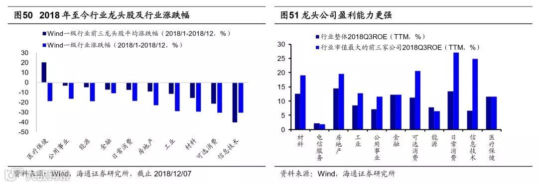 2018年价值成长风格弱化,龙头最强。我们研究发现美股、港股、A股都存在典型的大小盘风格轮换特征,美国大小盘(大盘指数:S&P100 VS 小盘指数:RUSSEL2000)轮换周期长度为3-6年,香港大小盘(大盘指数:恒生综指 VS 小盘指数:恒生小型股)轮换周期是2-5年。A股因为是新兴市场所以大小盘轮换周期更短,一般是2-3年。16-17年是典型的大盘价值占优行情,18年市场风格可以概括为价值成长风格弱化,龙头最强。年初至今代表大盘价值的上证50下跌15.0%,代表成长的创业板指下跌23.5%(截止2018/12/07),而16/1-17/12期间上证50涨38.5%,创业板指跌18.8%。盈利趋势是影响风格的核心变量,16-17价值占优的背后是上证50与创业板指累计净利润同比之差从16Q1的-84.7%升至17Q4的52.8%,而18年价值成长风格弱化的原因则是两者盈利增速出现收敛,两者净利润同比18Q3降至17.0%。但龙头效应在18年仍在强化,选取中信一级行业中市值最大的龙头股构建组合,截止2018/12/07,按自由流通市值加权计算组合18年累计涨幅约-15.6%,表现明显好于全部A股平均涨幅-25.81%和涨跌幅中位数-28.97%。盈利数据表明龙头公司业绩更优,根据Wind行业分类,信息技术总市值最大的三大龙头公司(行业整体)的18Q3ROE(TTM)为24.9%(6.5%),金融为12.3%(12.2%),房地产为19.5%(14.4%),公用事业为11.5%(7.0%),材料为19.0%(12.5%),能源为6.5%(7.8%),工业为12.7%(8.5%),日常消费为27.1%(13.5%),可选消费为20.6%(11.1%),电信业务为1.9%(2.1%),医药保健为11.5%(11.6%)。