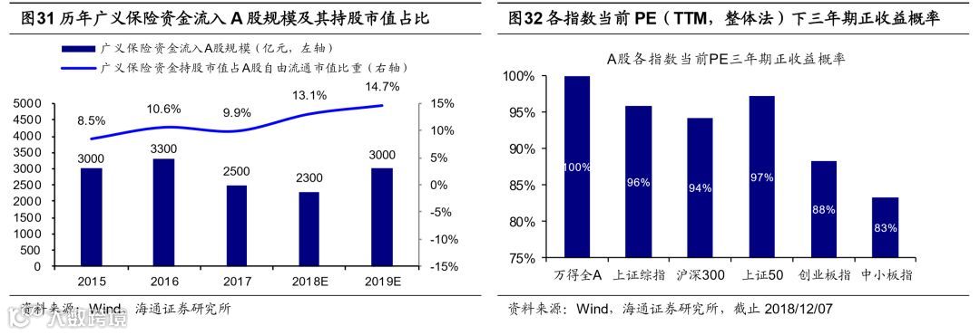 制度改革将推动A股从交易型市场走向配置型市场。A股未来也将像美股一样成为一个配置型市场,而制度改革将铺平A股前进的道路。制度改革包括发行制度改革与长线资金引入两方面。发行制度方面,A股过于严苛的发行制度导致A股结构失调,周期股占比较大而BATJ类新兴科技股难以上市。我国关于发行制度的改革正在稳步推行,今年3月我国允许海外新经济企业通过CDR的形式回归A股,11月国家领导人提出将在上海证券交易所设立科创板并试点注册制。未来更多的优质公司有望将在A股上市。资金面上,我国正积极引导国内外长线资金引入股市。外资方面,今年6月A股纳入MSCI新兴市场指数, 9月富时罗素也宣布明年6月开始将A股纳入其指数体系。我们预计明年外资流入A股的规模约在3500-4000亿元人民币。国内长线资金主要指的是广义保险资金,包括社保基金与基本养老金、企业年金和职业年金以及保险公司资金。2017年我国广义保险资金持股市值占A股总市值比重为3.7%,而根据证监会的论文《国外保险资金与股票市场》,美国1950年该比重为4.1%,1970年为12.4%,1998年为29.6%,我国险资还有很大发展空间。目前我国养老目标基金与个税递延养老保险都已在推进中,基本养老金也逐步入市,我们预计明年广义保险资金入市资金规模在3000亿元人民币左右。制度改革将助力A股走向配置型市场。目前A股估值正处在底部区域,2005年以来A股各大指数在当前PE下三年投资期取得正收益的概率分别为万得全A 100%,上证综指96%,沪深300 94%,上证5097%,创业板指88%,中小板指83%, A股配置价值明显。此外, 最迟到2021年,保险公司将采用根据IFRS9修改的新会计准则,其中中国平安已在今年由旧准则切换为新准则。新准则下险资将加配高ROE高股息个股,这将对未来A股各指数形成重要支撑。