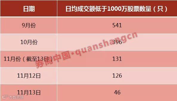 据券商中国记者统计,9月份日均成交额低于1000万的股票共有541只;10月份有所减少,日均成交额低于1000万的股票共有396只;11月份(截至13日)日均成交额低于1000万的股票数量降至131只。
