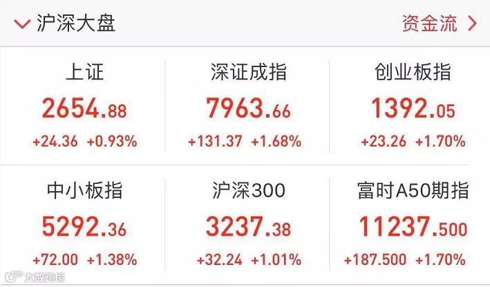A股三大股指低开后强势上行,截至收盘,三大股指全线飘红,而且涨幅都不小:沪指收涨0.93%,报2654.88点;深成指收涨1.68%,报7963.66点;创业板指收涨1.70%,报1392.05点。