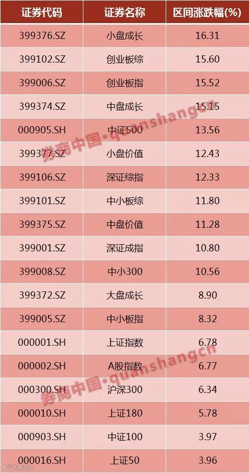 从各大指数表现来看,自10月19日至今,涨幅前三名均与中小创有关,分别是小盘成长、创业板综和创业板指,涨幅均超15%,分别达到16.31%、15.6%和15.52%。涨幅位居末尾的则是以大盘股为主,分别是上证180、中证100、上证50,涨幅仅有5.78%、3.97%和3.96%。