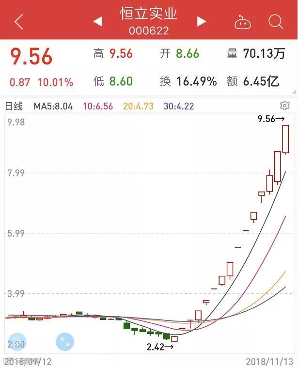 先来看“妖王”——恒立实业:自10月22日开始至11月13日,14个交易日内(期间有停牌)收获13个涨停板,区间涨幅达270.54%。