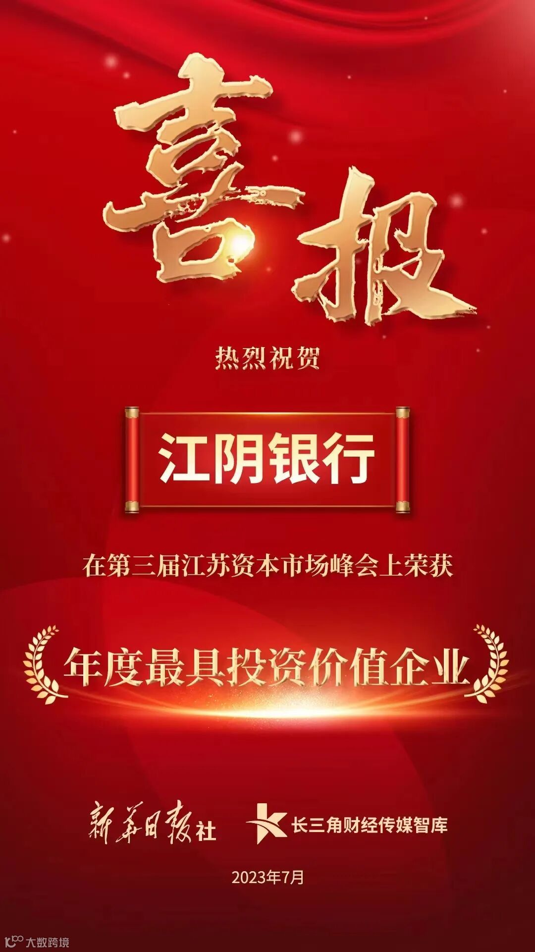 喜报 | 江阴银行荣获“年度最具投资价值企业”!