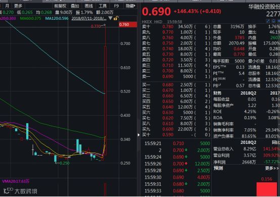 今日午后,华融投资股价直线飙升,一度暴涨逾175%,收盘上涨146.43%,报0.690港元/股,成交额高达2070万港元。值得注意的是,上一个交易日,华融投资的成交额仅为6万港币。