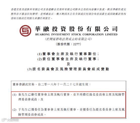 华融投资公告称,董事局主席秦岭由于个人原因,已辞任董事会主席及执行董事,自2018年11月27日起生效;同时,董事会宣布,于猛已获委任为执行董事及董事会主席,自2018年11月27日起生效。