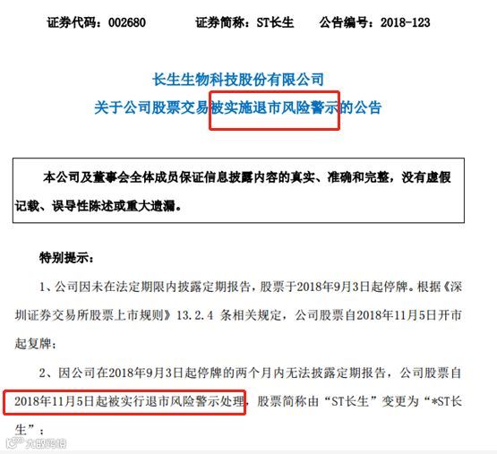 深交所最新的公告显示,因长生生物在2018年9月3日起停牌的两个月内无法披露定期报告,公司股票自2018年11月5日起复牌,同时被实行退市风险警示处理,股票简称由“ST长生”变更为“*ST长生”。