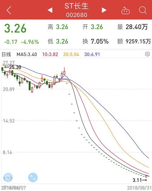 7月15日长生生物疫苗案爆发以来,股价连续32个跌停,创下A股市场跌停纪录,在市场等待第33个跌停之时,该股竟意外涨停,在停牌前一天又以跌停收尾。长生生物的股价也从24.55元跌至3.26元,市值从239.04亿元缩水至31.74亿元,长生生物总市值已经缩水超过200亿元。