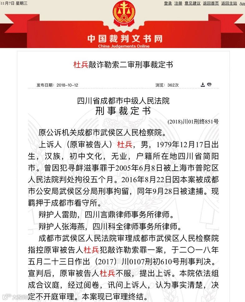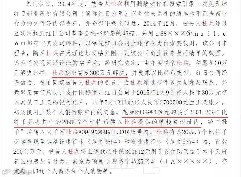 日前,中国裁判文书网上一份名为《杜兵敲诈勒索二审刑事裁定书》的刑事裁定书在网络上流传,A股上市公司红日药业曾被人勒索2099个比特币作为“封口费”。