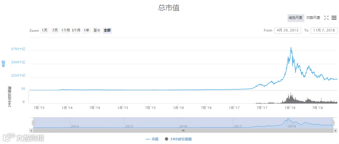 从加密资产总市值来看,据coinmarketcap数据,2013年末,全球加密资产市值约100亿美元,至2016年末为161亿美元,但到2017年末,其总市值暴涨至5729亿美元,呈高度泡沫化趋势,且波动巨大。