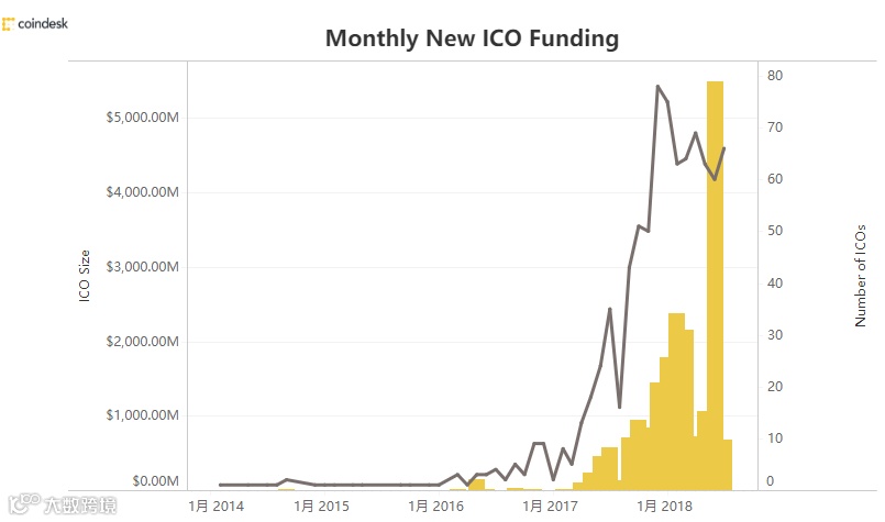 从coindesk收集的数据来看,全球ICO融资规模经过2017年一年的爬升,在2018年6月份达到顶峰,2018年7月,ICO融资规模大幅萎缩。