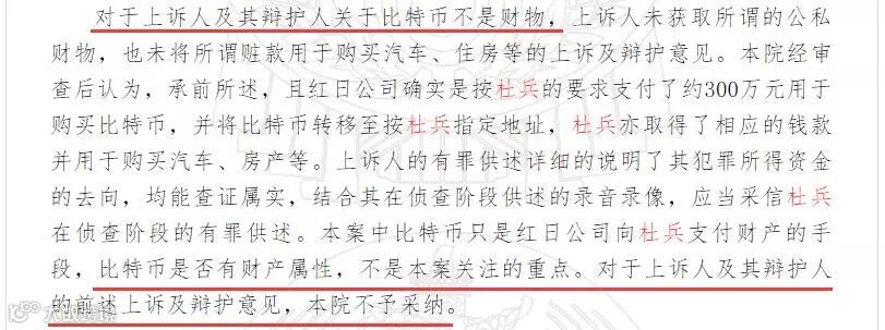 该案件判决书显示,杜兵及其辩护人在上诉及辩护意见中提出,在案证据不能证实上诉人收到了受害人支付的300万元人民币的财物,比特币属特定的虚拟商品,不属于我国刑法保护的财产,并有相应的司法实践,且仅凭上诉人的供述和汽车、住房登记在杜兵名下就认定其将所得赃款用于个人消费于法无据。