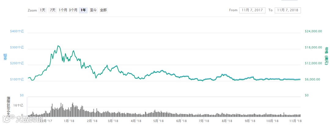 比特币价格同样经历了大幅跳水。据coinmarketcap数据,2017年12月17日,比特币价格为1.9万美元,一度突破两万美元当前价格则在6500美元左右徘徊,一年时间,跌幅超过60%。
