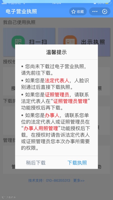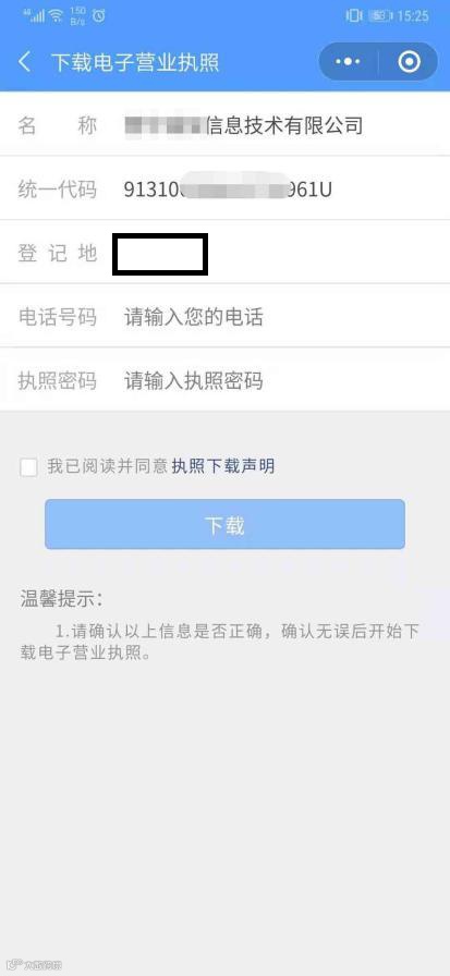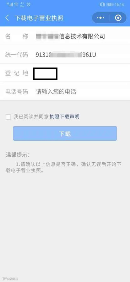 4.下载电子营业执照前,需要阅读并同意《执照下载声明》。如果本小程序上修改过密码,下载时需要输入修改后的密码。