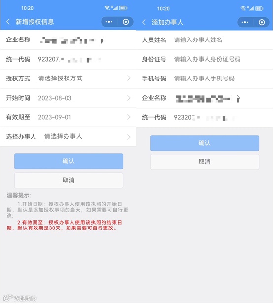 2.选择“授权方式”和“授权事项”,指定授权“开始时间”和“结束时间”,并添加相关办事人员信息。办事人领取该执照后,可以在执照有效期内办理与该授权事项相关的各项业务。