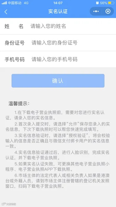 2.点击“下载执照”,输入法定代表人的姓名、身份证号、手机号,进行人脸识别,完成实名登记。