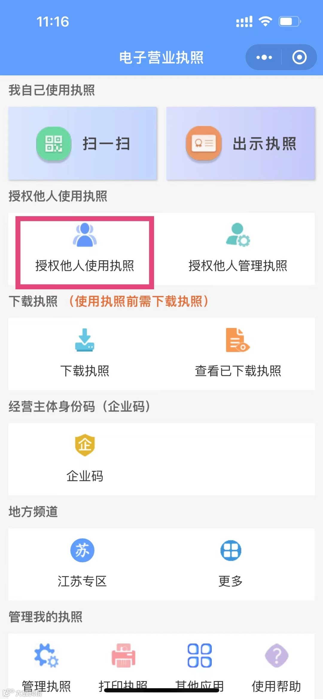 企业法定代表人完成首次领取后,也可根据公司内部管理要求将电子营业执照交由公司证照管理人员负责营业执照日常的使用管理。