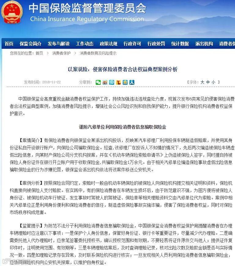 按照保险合同约定,索赔时一般由机动车辆保险的被保险人向保险机构提交相关证明和资料,保险机构直接向被保险人支付赔款。在实践中,有的保险消费者在车辆发生损坏后,由于防范意识不强,为图方便将被保险人身份证、被保险机动车行驶证、发生事故时驾驶人的驾驶证、保险单等相关理赔资料交由汽修单位代为索赔。案例中相关汽修单位正是利用身份便利和保险消费者的信任,制造虚假保险事故实施诈骗,侵害了保险消费者权益,同时对保险市场秩序构成危害。